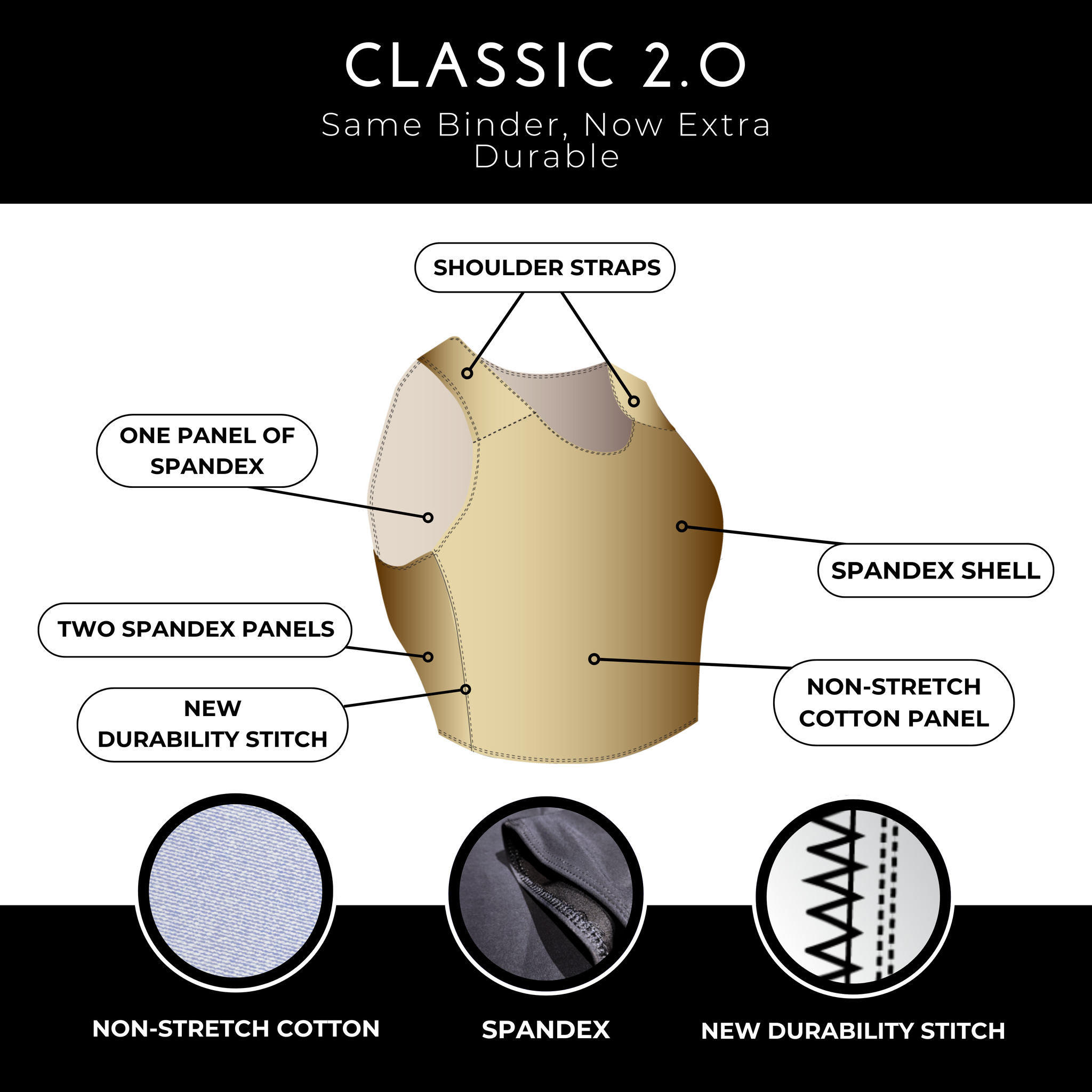 The Classic 2.0 is our NEW standard chest binder. It retains our original design but now features an added durability stitch. We added this running stitch due to customer feedback so we can ensure that your binder is extra equipped to handle the stresses of frequent use.