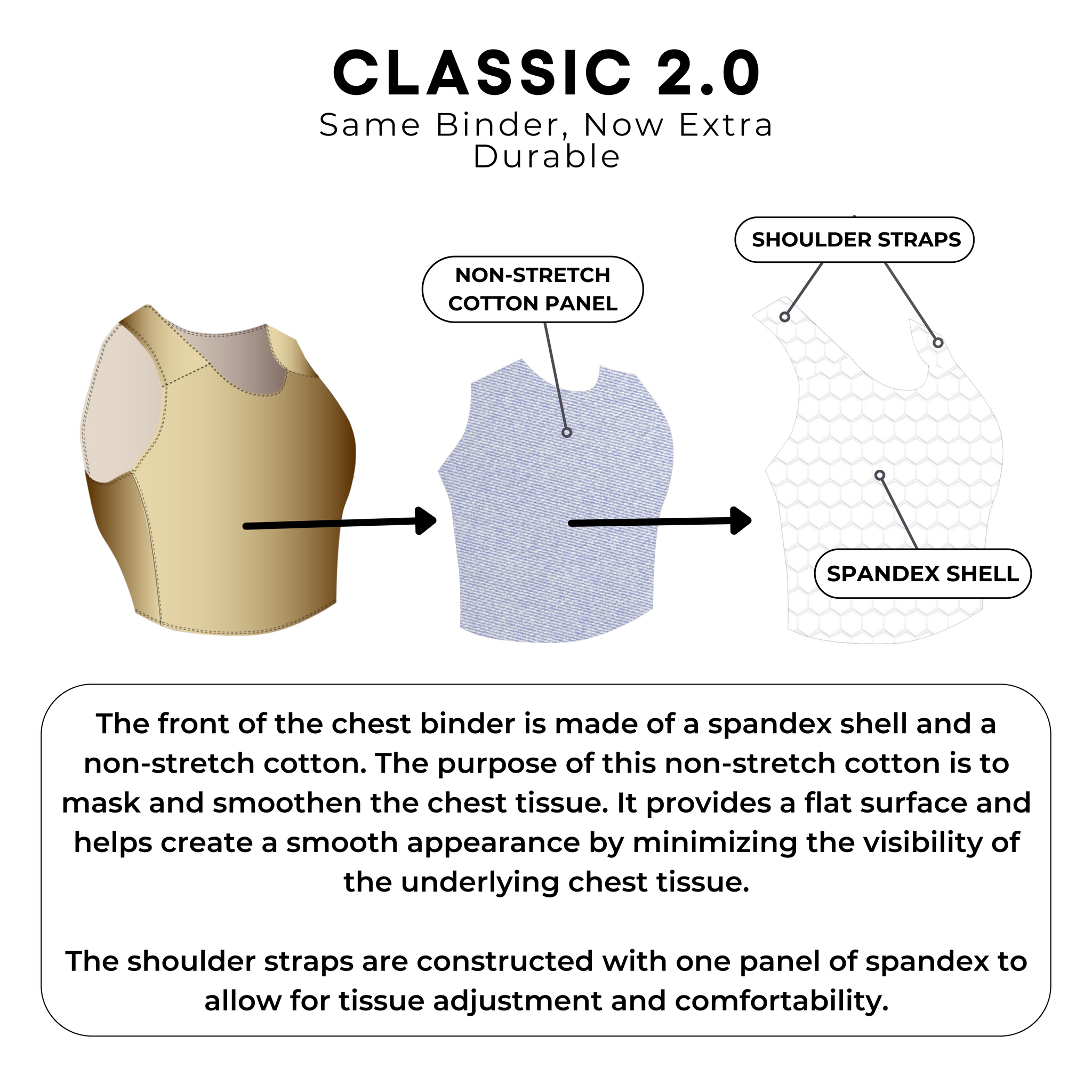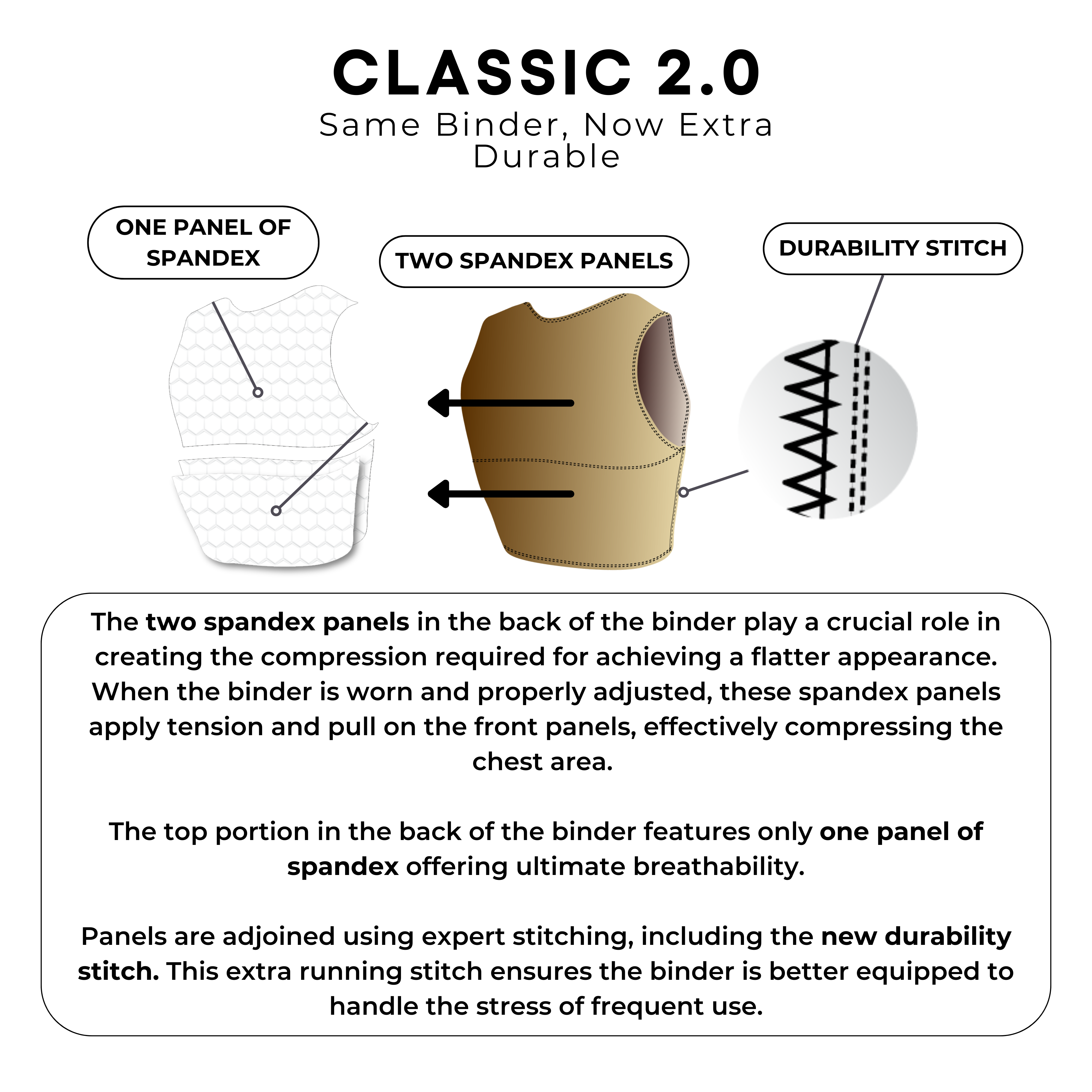 The Classic 2.0 is our NEW standard chest binder. It retains our original design but now features an added durability stitch. We added this running stitch due to customer feedback so we can ensure that your binder is extra equipped to handle the stresses of frequent use.